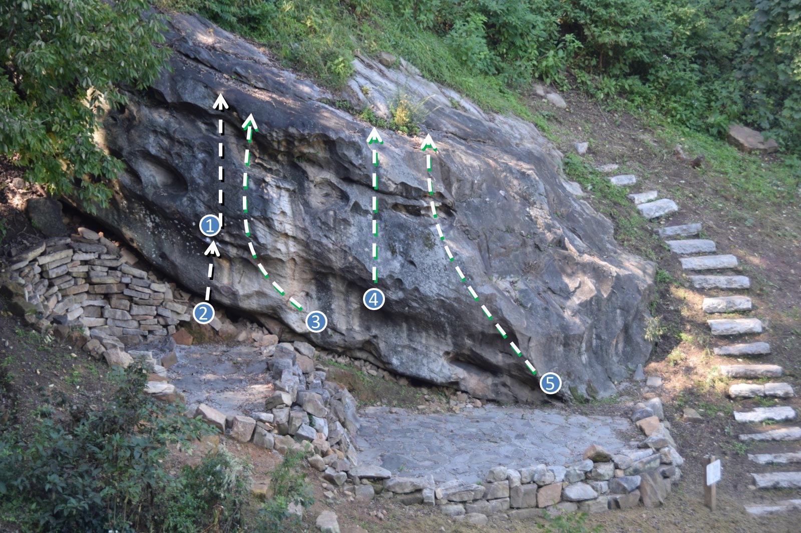 The Lookout Sit — V3: Sit start on the small crimps and make a big move up to the chicken head and climb straight up as per the stand start. (The foot pedestal attached to the boulder is on).