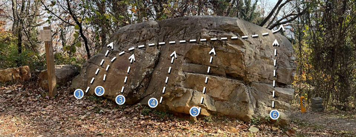 One of the most popular boulders on the land. The Turtle has super steep slopes and smooth surfaces, resembling a turtle shell. Climbers have had a hard time being able to mount this beast of a boulder.