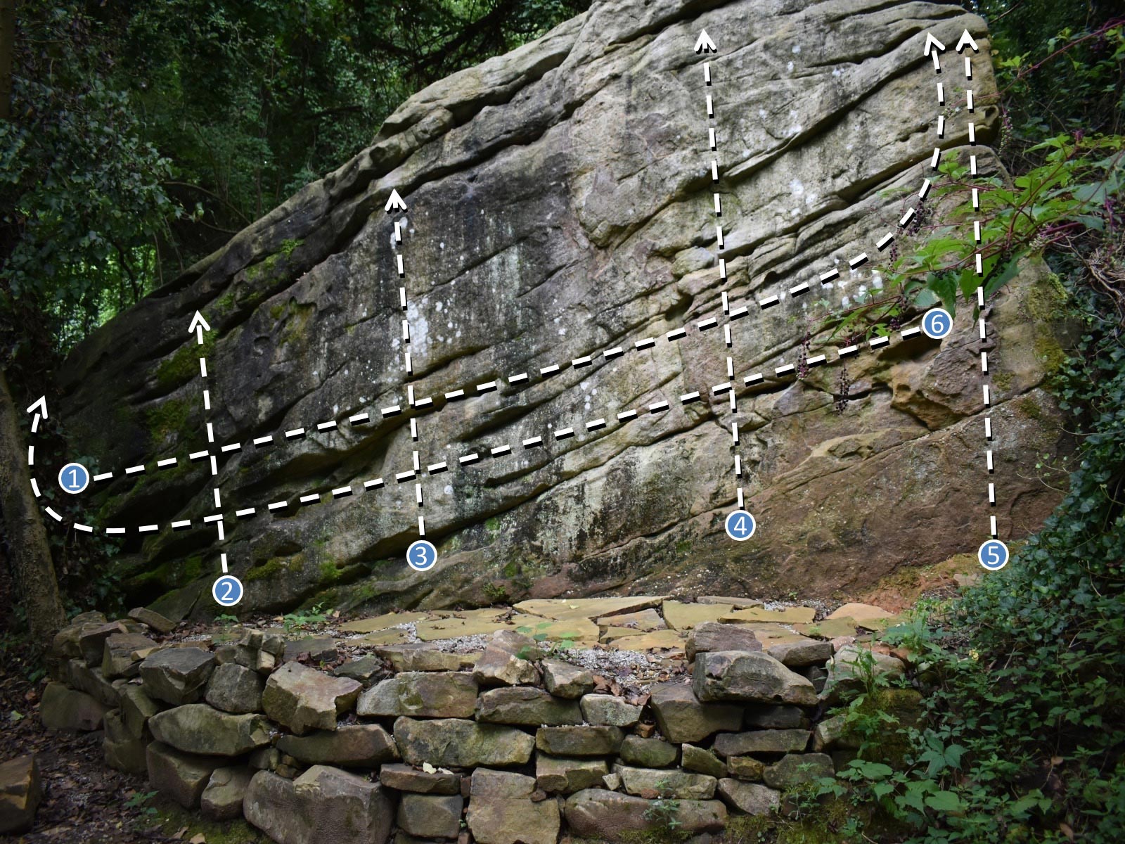 Everybody to the Left — V1: Traverse far Left to right, topping over the slopey bulge.